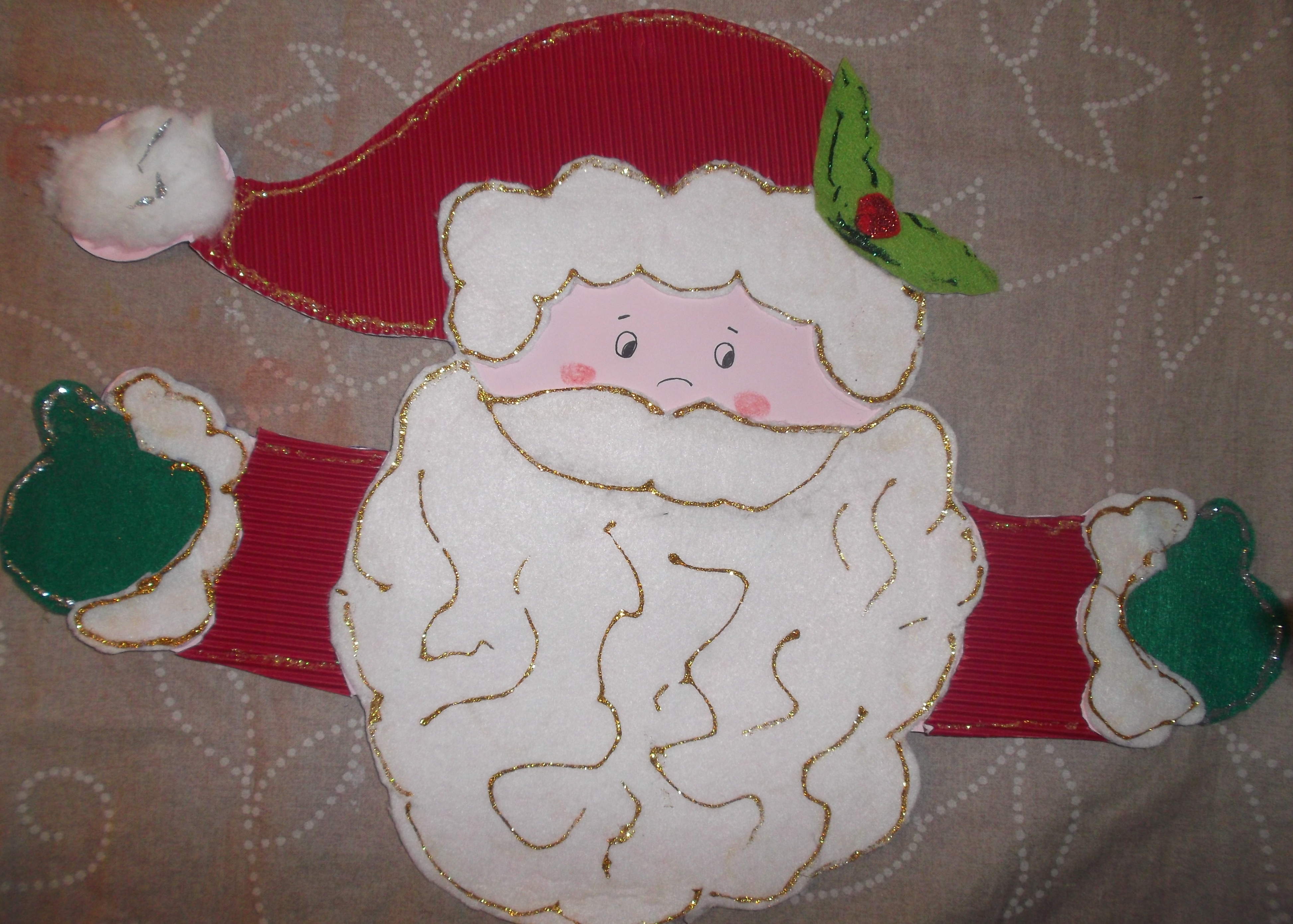 Este es el Papa Noel que hemos hecho para la puerta de entrada, con cartulina ondulada, fieltro, y purpurina dorada. ¡¡Para dar una cálida bienvenida a todo el que llegue a casa!!