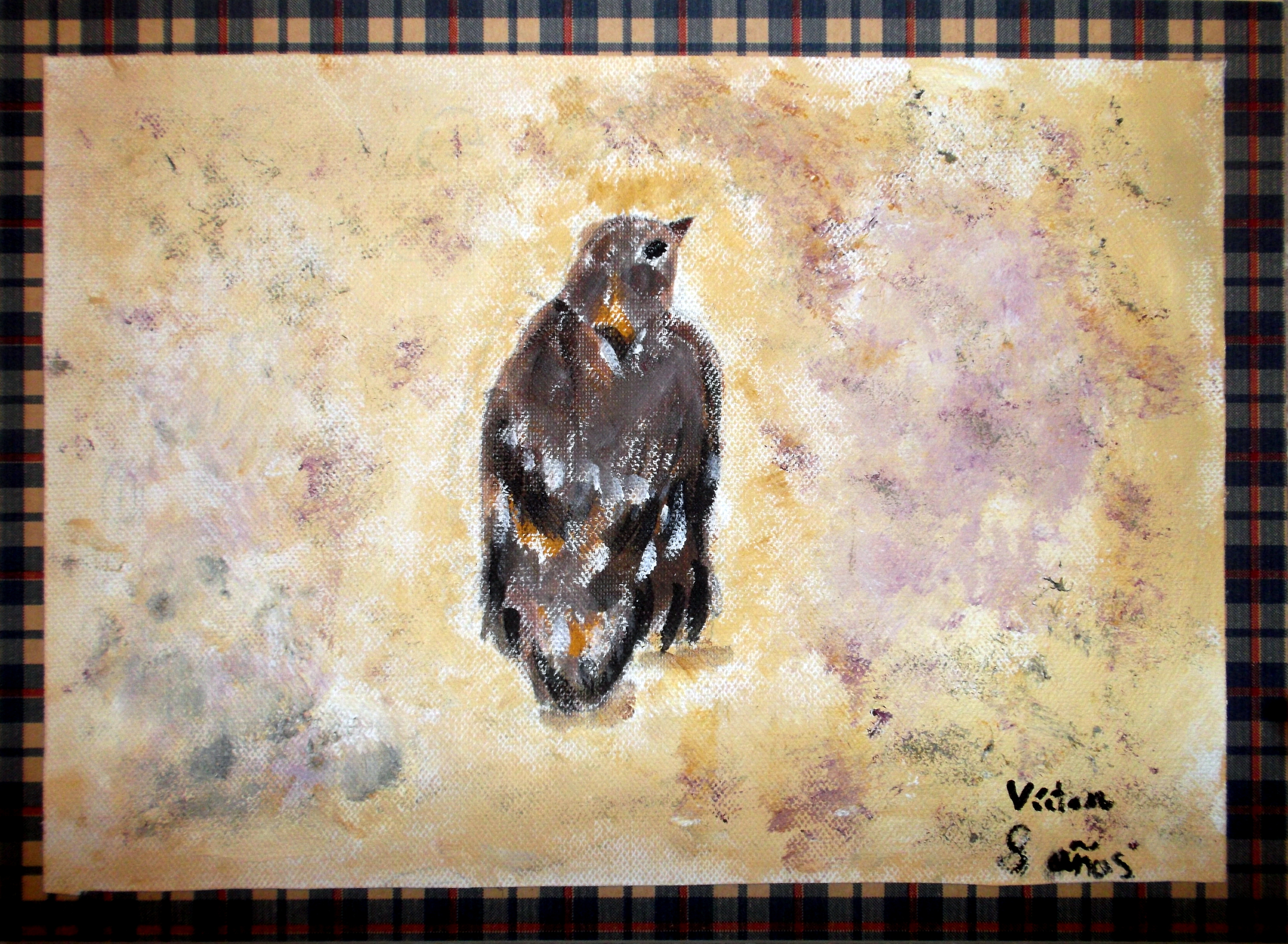 A Víctor le gustó mucho el gorrión que pintó Sofía en acrílico, y le pidió permiso para copiarlo. Lo ha hecho en la misma técnica y le ha quedado espectacular. Para los que no podéis asistir a la exposición, aquí tenéis esta obra maestra: