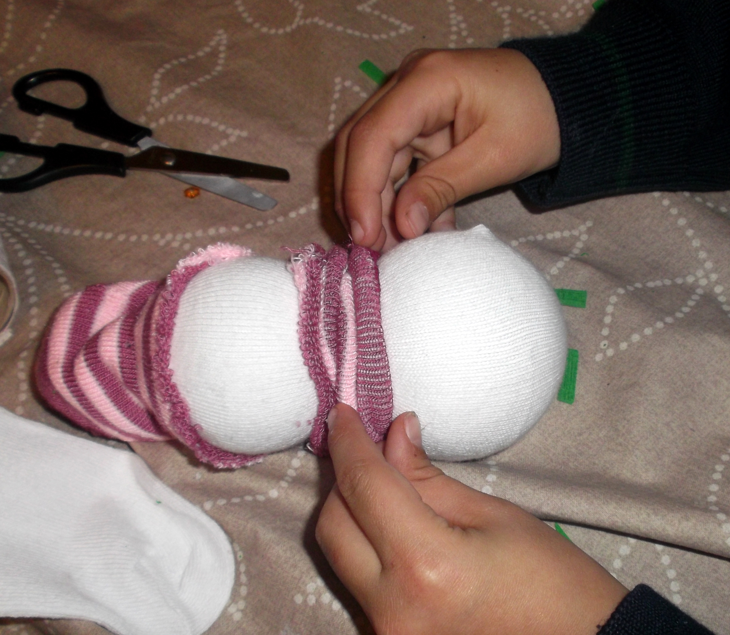 Despues cortamos el otro calcetin en dos partes. La que esta cerrada la pegamos en la cabeza en forma de gorro, y la otra la ponemos entre las dos bolas a modo de bufanda. Podemos apretarla haciendo un lazo con una cinta.