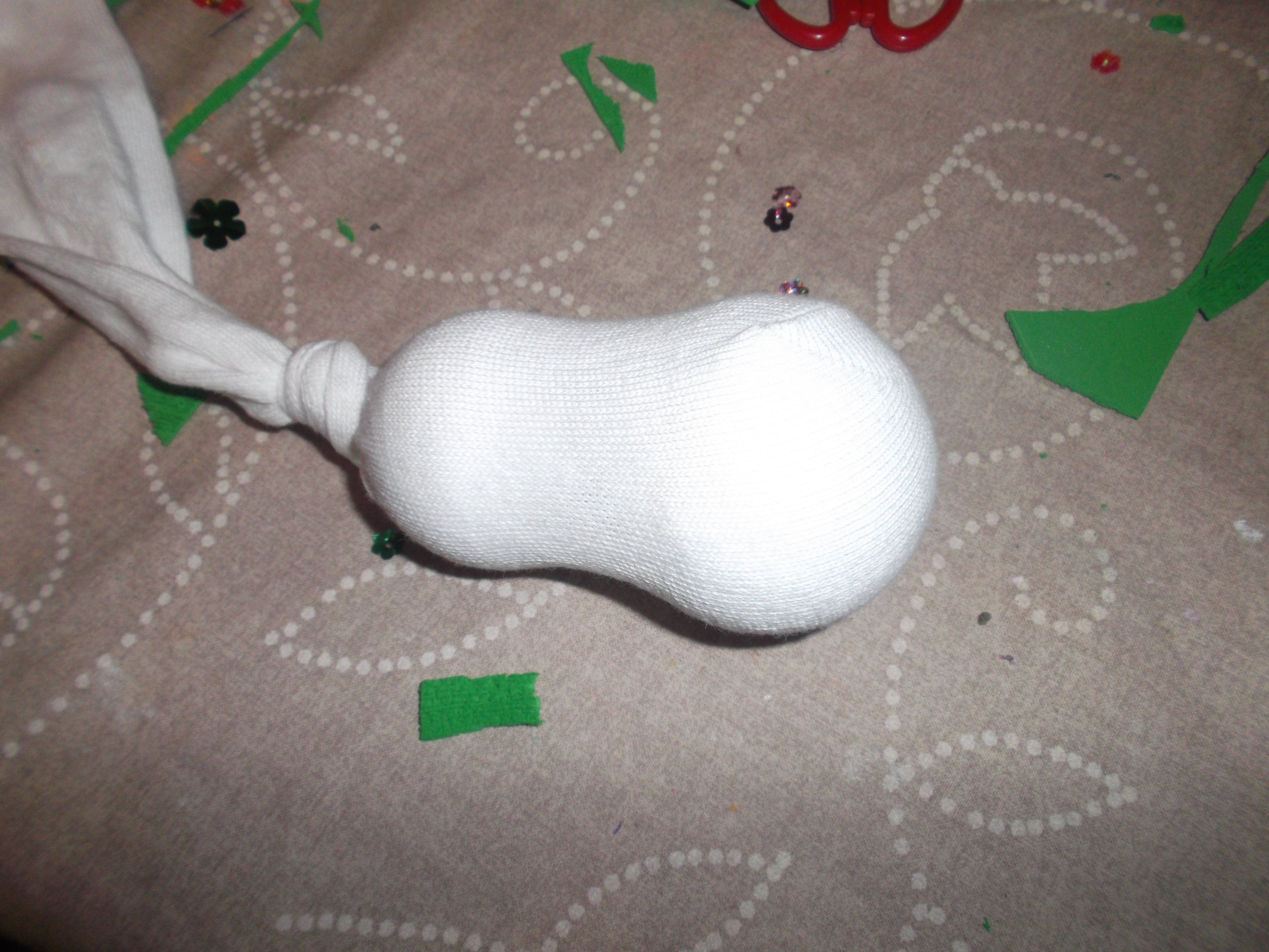 Metemos en el calcetin blanco primero la bola grande (que será el cuerpo) y despues la bola pequeña que será la cabeza. Apretamos bien el calcetín y anudamos fuerte. Cortamos lo que nos sobra del nudo. No os preocupeis porque luego queda tapado con el gorro.