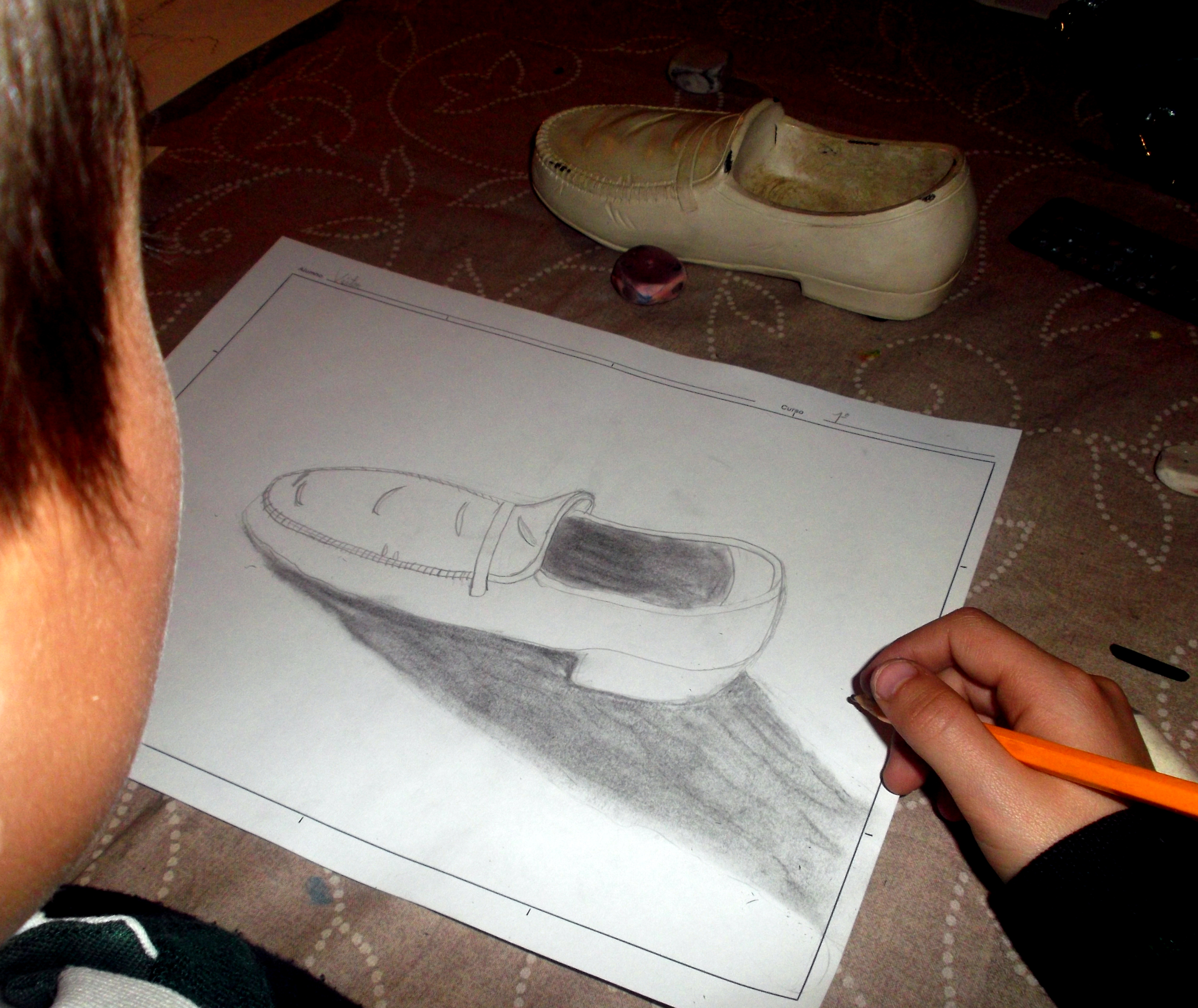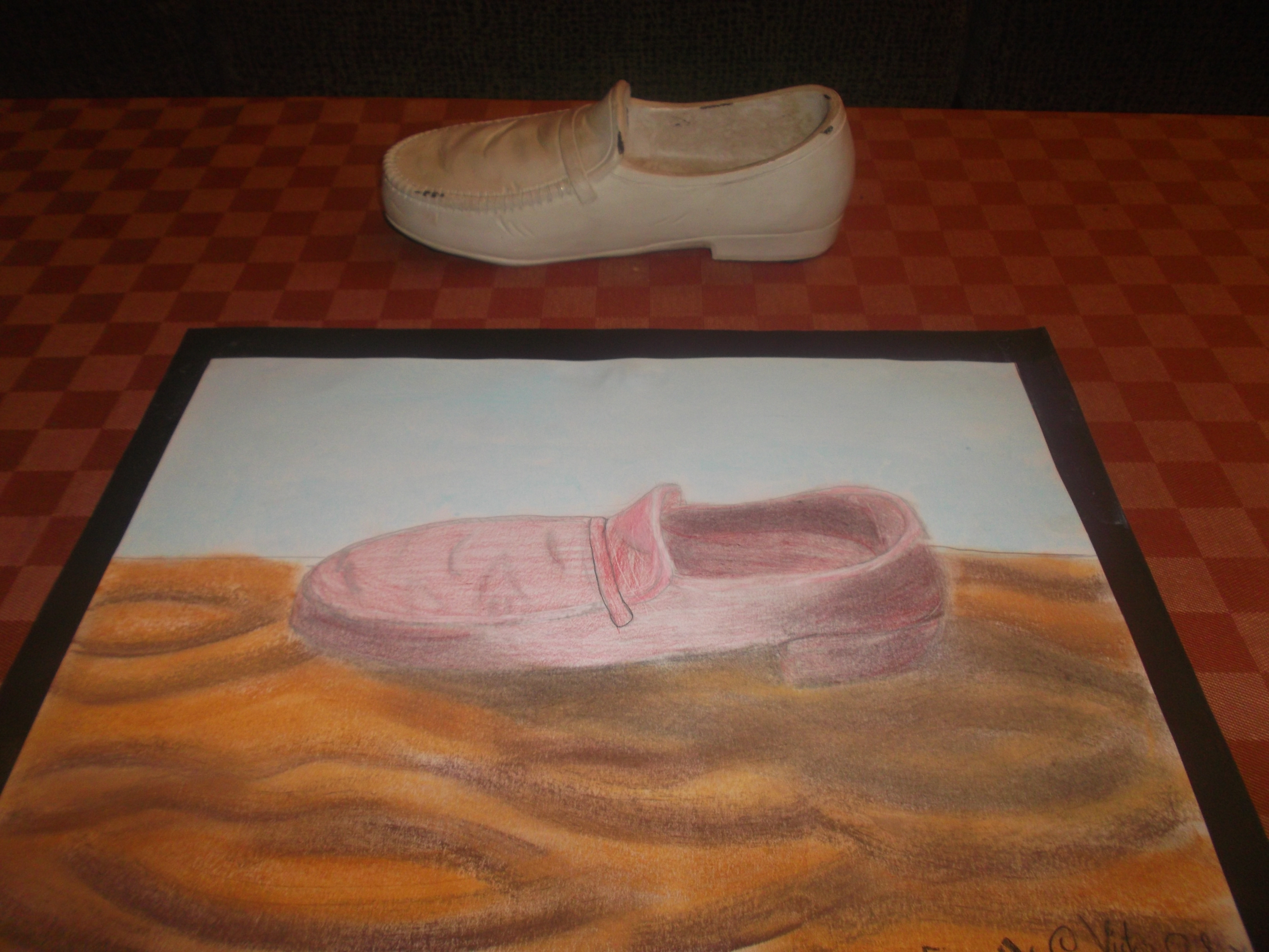 Primo dibujo copiando el modelo a lápiz y sombreó a carboncillo. Le estaba quedando muy bien, pero lo que más me gusto y creo que es el encanto de su trabajo, fue la terminación, coloreando el zapato, y pintando a pastel una base y un fondo inventados.