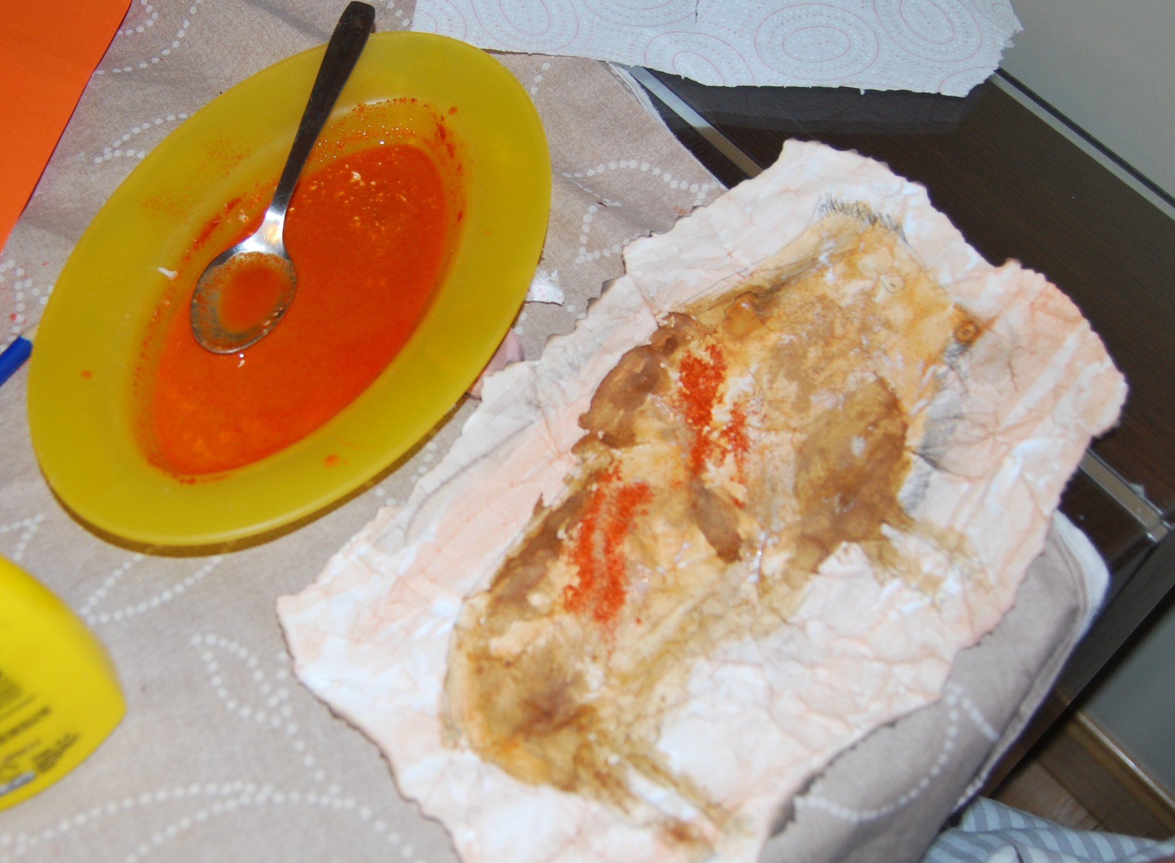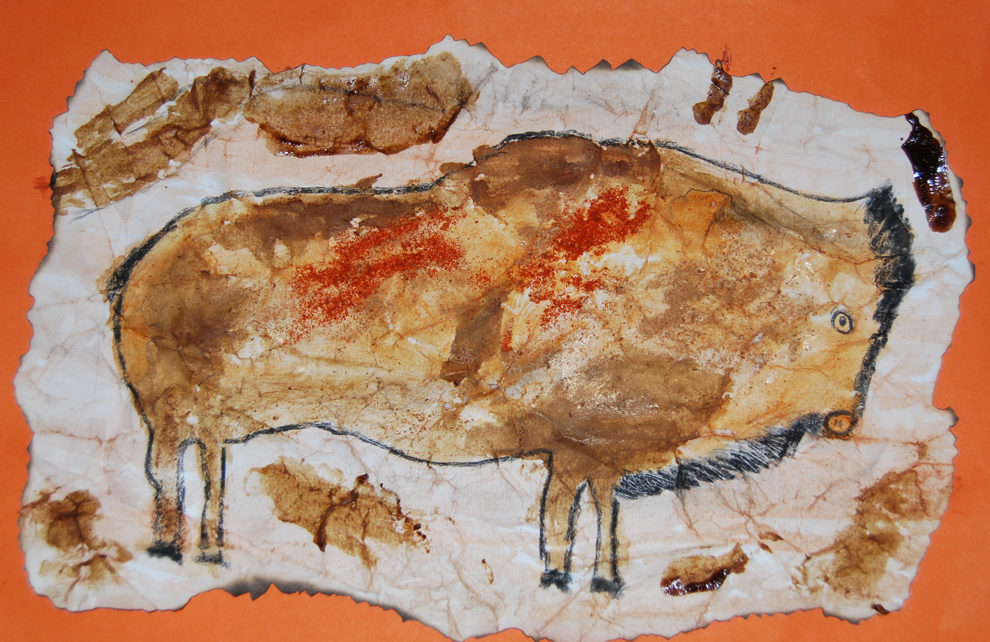 Luego dibujamos un motivo prehistorico… y ahora biene lo mejor. Buscamos por casa todo tipo de pigmentos naturales: azafran, pimenton dulce, canela en polvo, cacao, cafe.. y lo mezclamos con un poco de agua para obtener colores. Luego lo aplicamos con los dedos y si queremos repasamos nuestro dibujo con cera negra. ¿A que quedan estupendos?