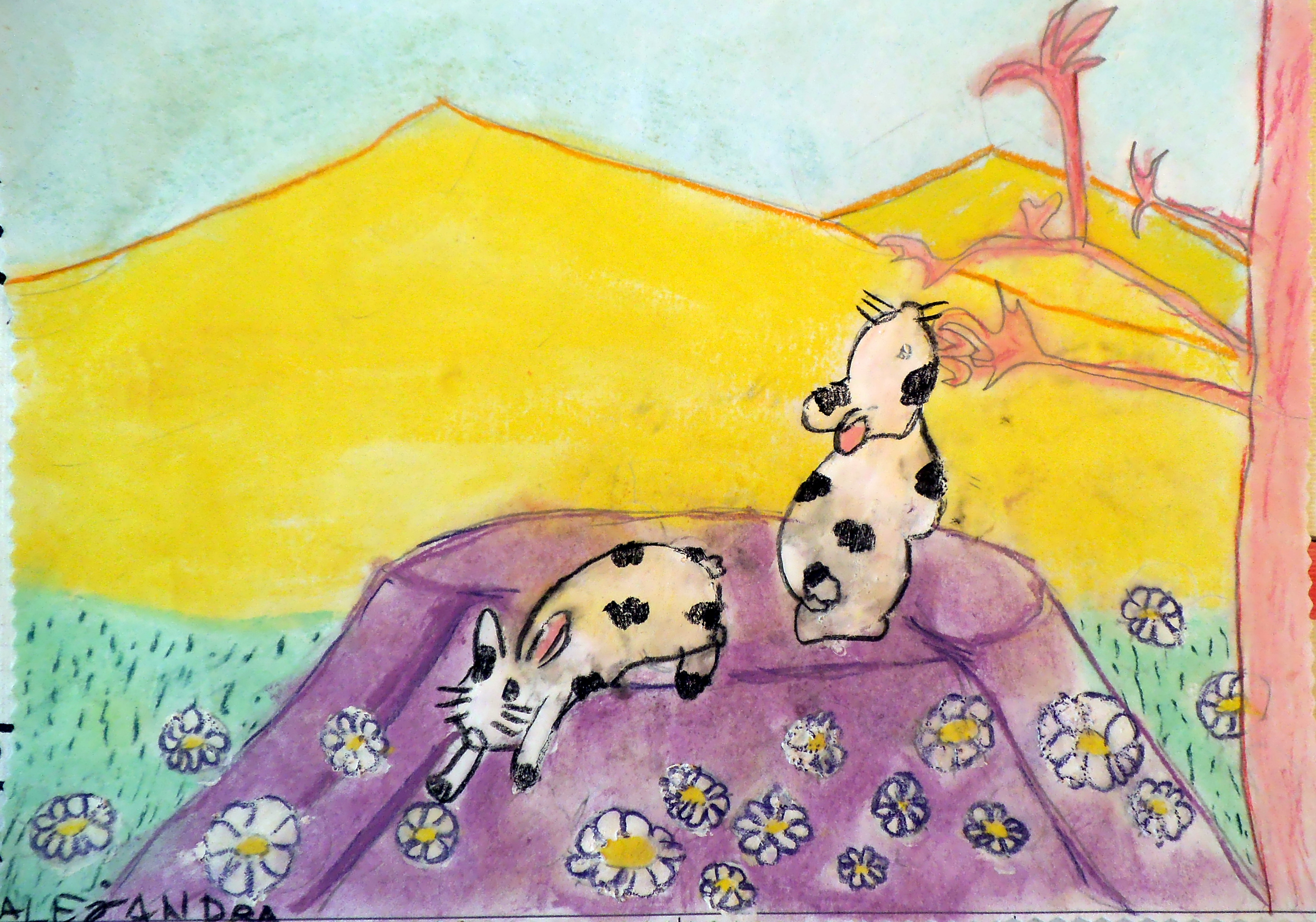 Con pasteles y acrílico, Alejandra ha dibujado estos encantadores conejitos. Ha decidido pintarlos blancos con manchas negras, y la verdad es que están preciosos con esos colores. Y no os digo nada del color amarillo de las montañas y el morado del trono ¡¡un resultado súper alegre y muy personal!! Igualito, igualito que la artista.