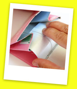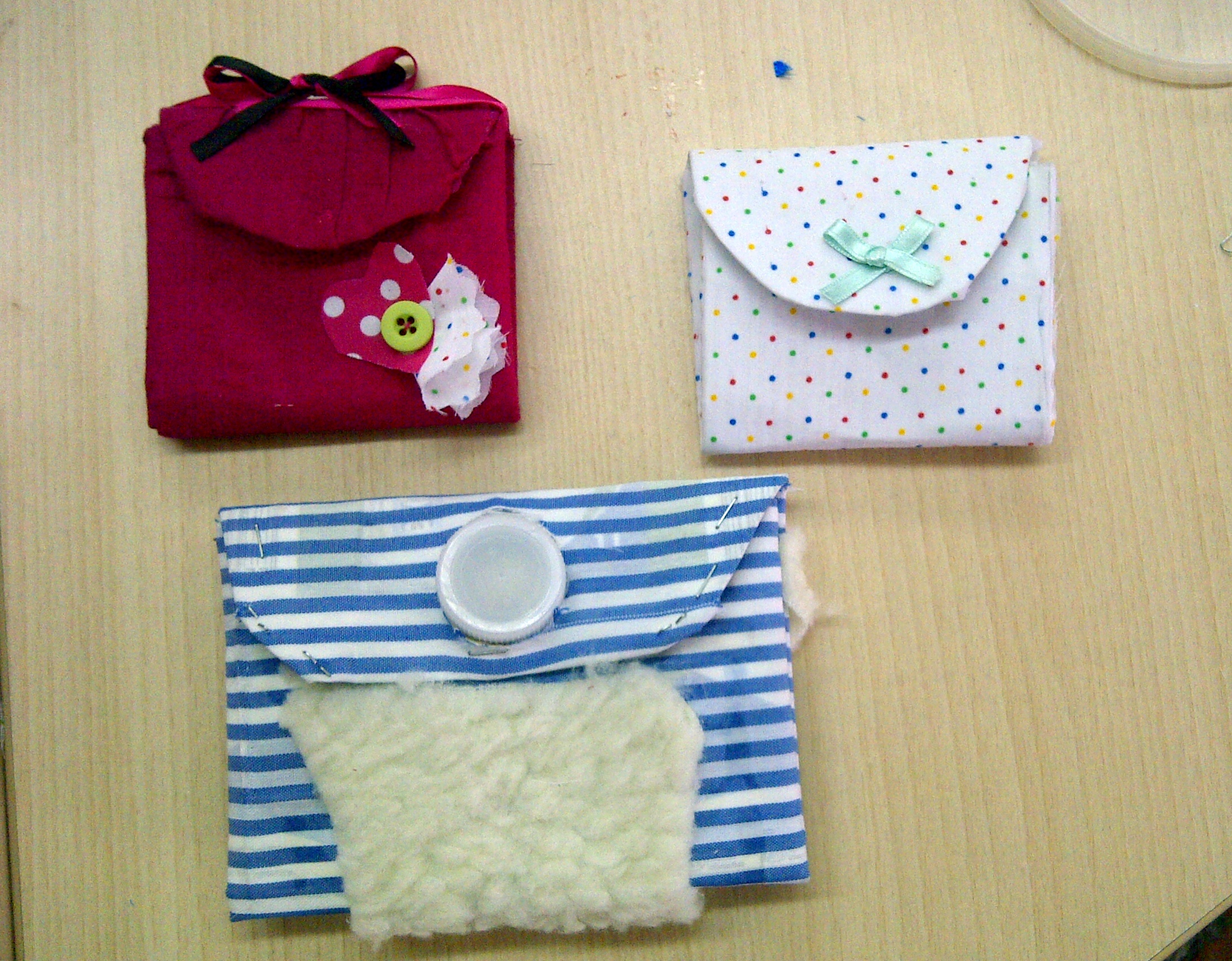 Despues de haber hecho todos los dobleces, nosotros lo volvimos a abrir para forrarlo con telas de diferentes diseños. Las pegamos con una barra de pegamento escolar. Les pusimos un velcro y quedaron unos monederos personalizados y muy originales
