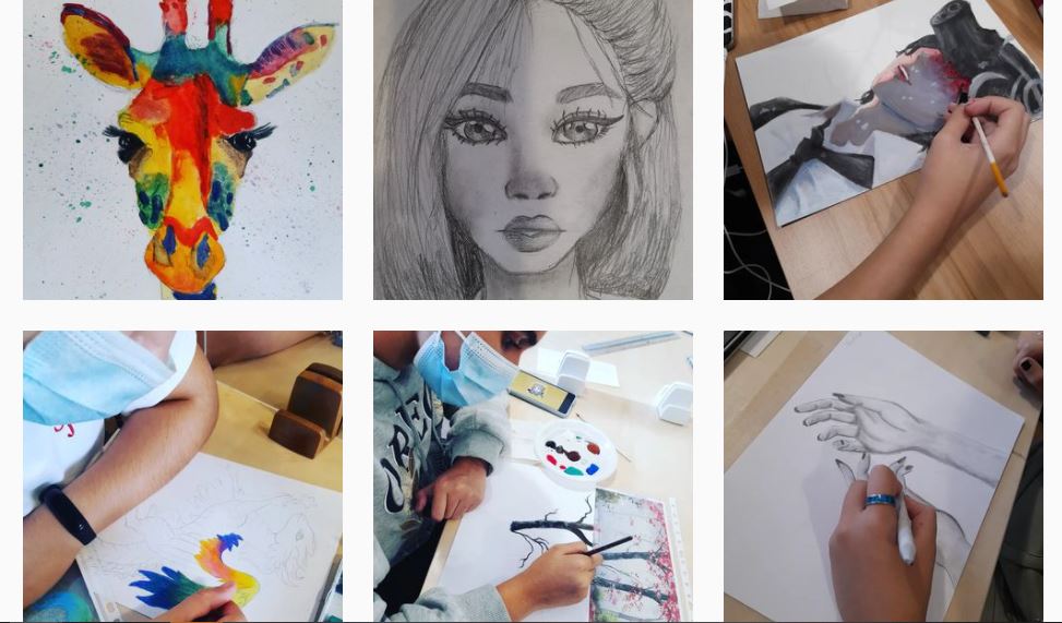 Blanca, 13 años, ejercicio de carboncillo dibujando unas manos. Ángela, 16 años, empezando un paisaje con temperas. Lydia, 14 años trabajando con lápices de colores. Olivia, 14 años, pintando con oleo. Retrato a carboncillo. Gema, 11 años. Preciosa jirafa en acuarela. Carlota, 10 años.