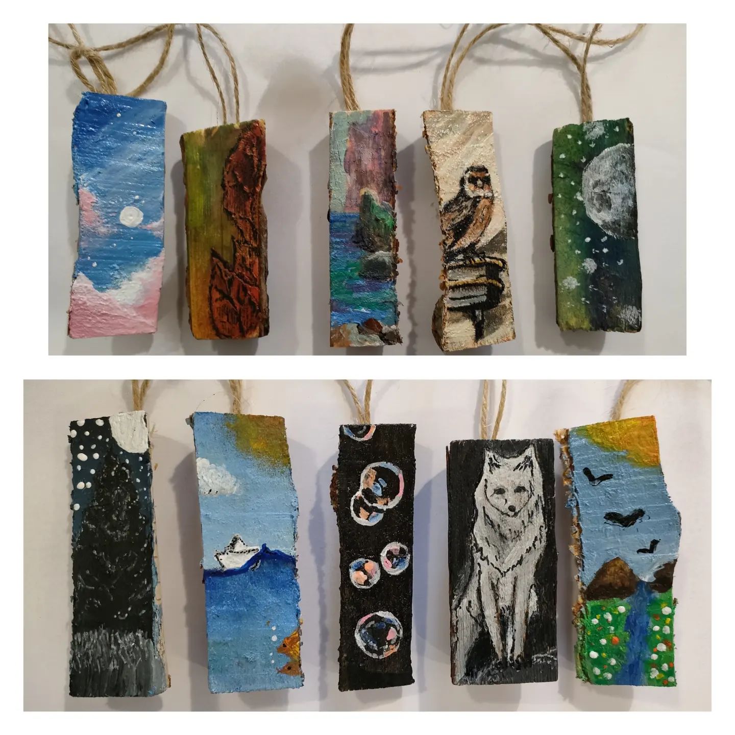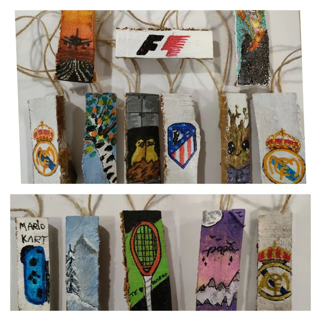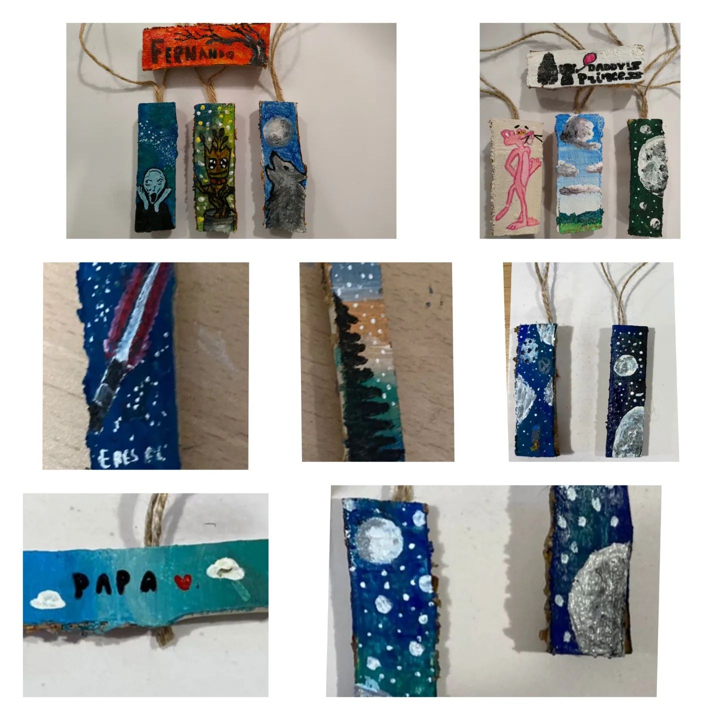 Os dejo los colgadores que han hecho los pequeños artistas como regalo del día del padre. Han realizado pequeñas obras de arte sobre troncos partidos por la mitad a los que han pegado una cuerda a modo de colgador para que sus padres los puedan poner en el retrovisor del coche o donde prefieran. ![]()