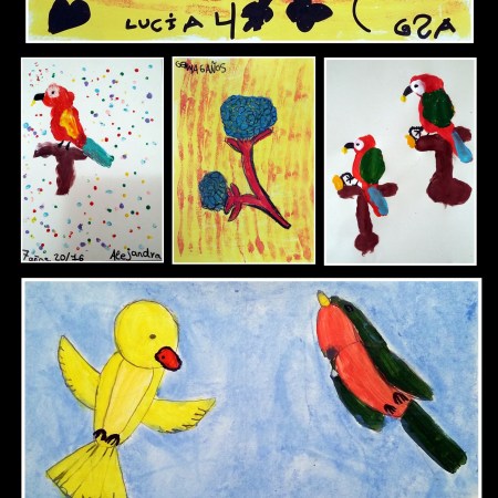 FLORES Y PAJAROS PINTADOS POR NIÑOS EN TEMPERAS Y PASTELES